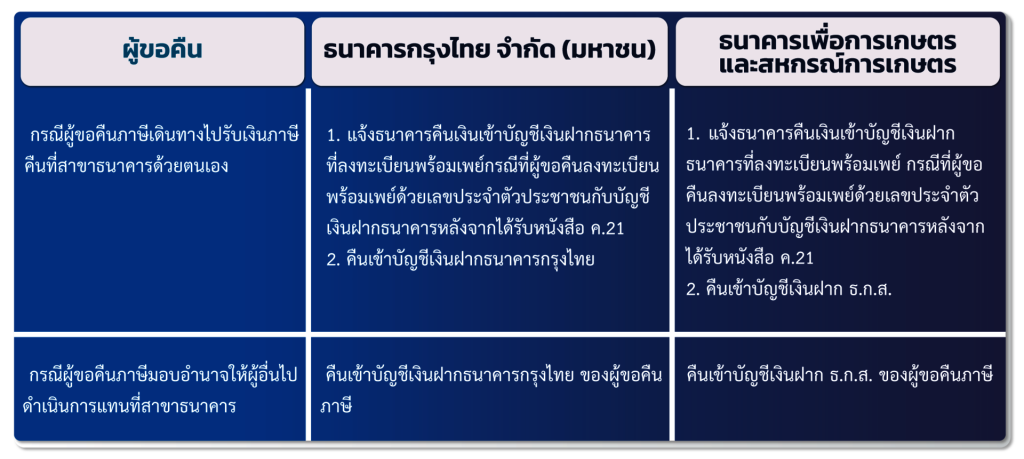 2. การคืนเงินผ่านสาขาธนาคารกรุงไทย จำกัด (มหาชน) และธนาคารเพื่อการเกษตรและสหกรณ์การเกษตร (ธ.ก.ส.) กรณีผู้ขอคืนเงินภาษีไม่ประสงค์รับเงินภาษีคืนด้วยการโอนเงินภาษีคืนเข้าบัญชีเงินฝากธนาคารที่ลงทะเบียนพร้อมเพย์ กรมสรรพากรจะออกหนังสือแจ้งคืนเงินภาษีเงินได้บุคคลธรรมดา (ค.21) เป็นหลักฐานเพื่อนำไปติดต่อรับเงินคืนที่สาขาธนาคารธนาคารกรุงไทย หรือธนาคารเพื่อการเกษตรและสหกรณ์การเกษตร ดังนี้